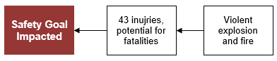 The analysis can continue by asking Why questions and moving to the right of either of the cause-and-effect relationships above. In this example we’ll start with the 43 injuries and potential fatalities which were caused by the violent explosion and fire.