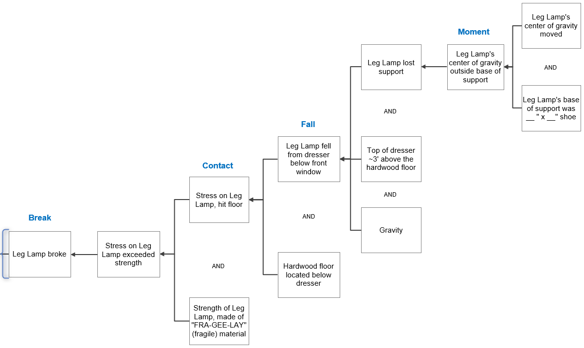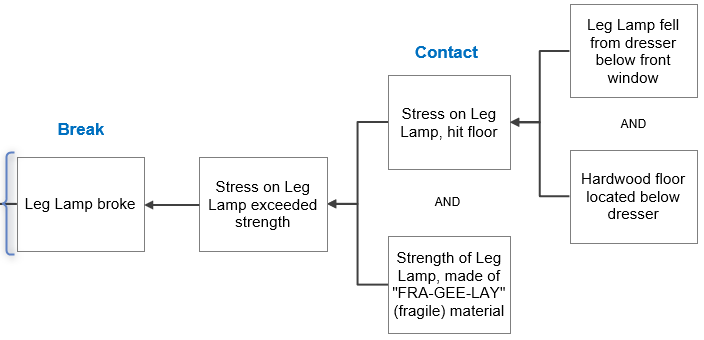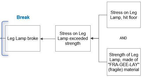 In the 9-Why above, I’ve used blue labels to call out examples of fundamental relationships of cause and effect. These relationships represent consistent physical patterns that always build in the same way. For example, whenever we see “break” in a Cause Map diagram, we know that an object breaks when the stress applied to it exceeds the strength of the object. In this case, the Leg Lamp broke because it hit the floor (stress applied to it) and it was famously made of “FRA-GEE-LAY” material (obviously in Italy), which lacked the strength to withstand the impact.